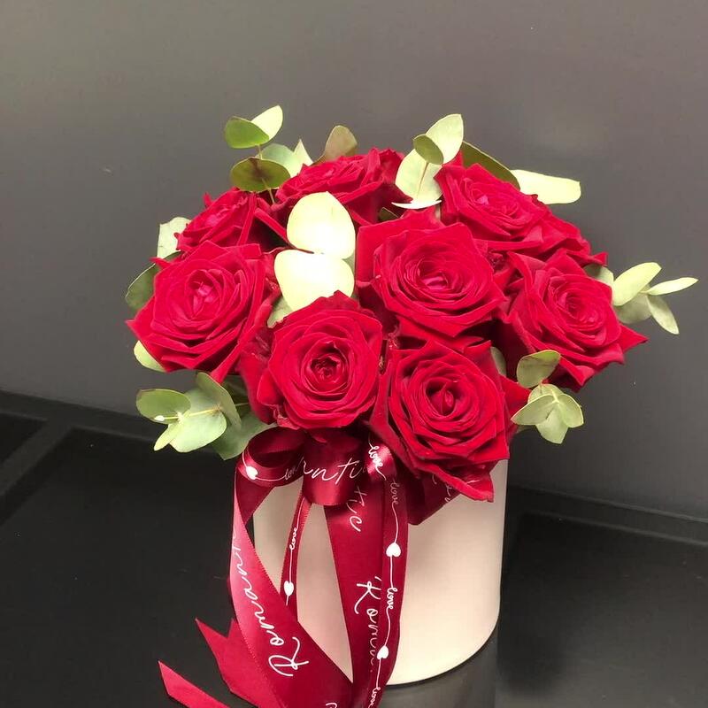 Стильная коробочка роз с эвкалиптом станет приятным подарком на любой повод!