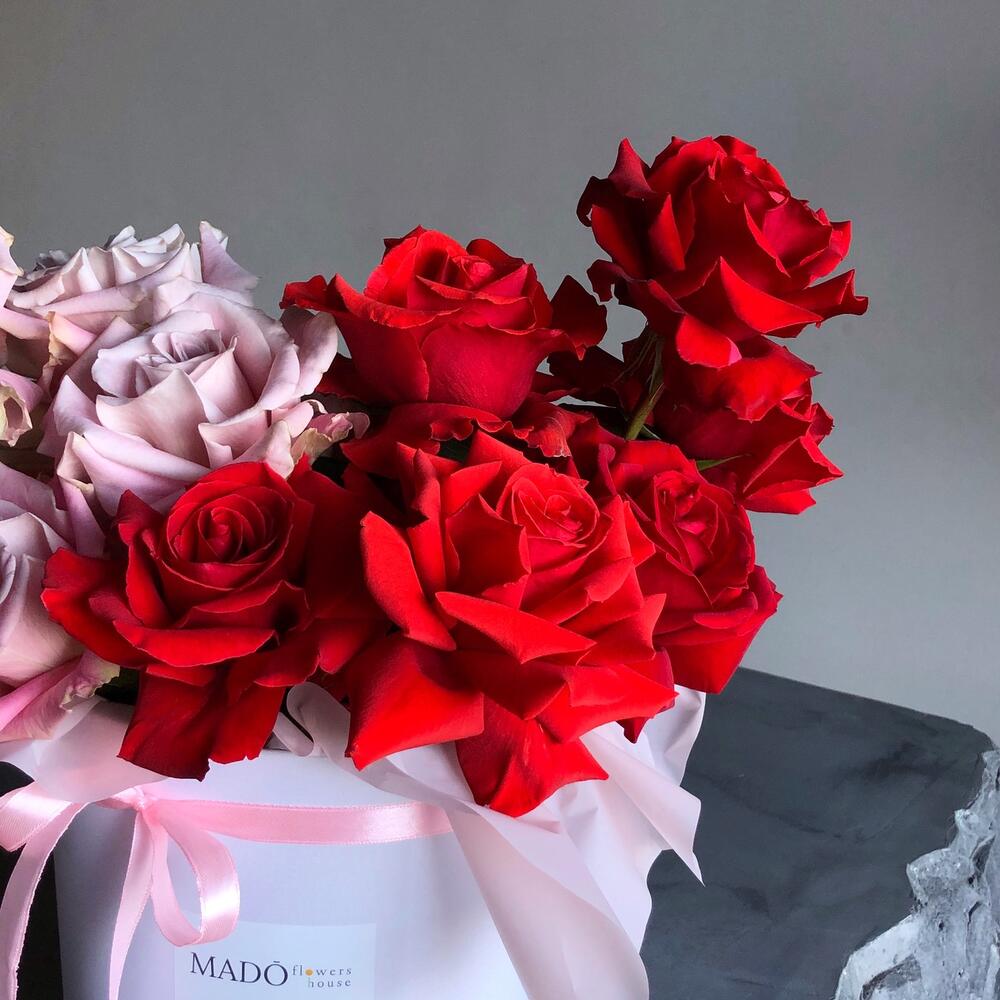 Коробка заполнена цветами со всех сторон, пустых мест нет!Дизайнерская композиция 50/50 из самых крутых сортов роз. Пудровая роза, редкого оттенка Faith и, по-настоящему, АЛАЯ, а не бордовая роза Nina. Каждый бутон раскрыт вручную по специальной технике для большей пышности и «Вау!» эффекта. На стойкость и качество цветка раскрытие никак не влияет.Все наши букеты доставляются в воде и транспортировочной коробке, поэтому можете быть уверены, что каждый цветок доедет в целости и сохранности:)Не храните букет возле отопительных приборов и под прямыми солнечными лучами! Раз в два дня в губку можно подливать пол стакана воды.