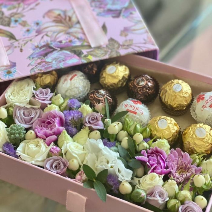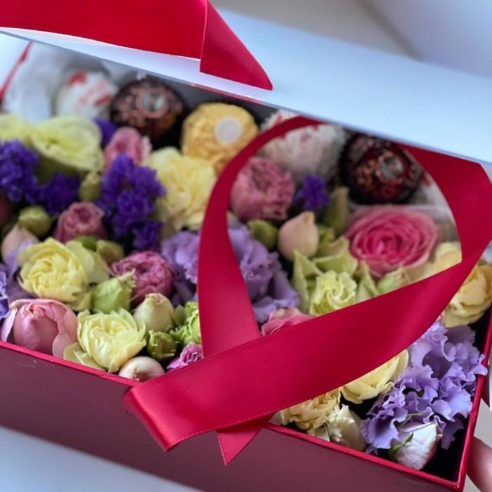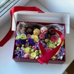 Гиперикум – 3 шт.Кустовая роза – 2 шт.Зелень – 1 шт.Хризантема – 3 шт.Эустома – 1 шт.Оазис – 1 шт.Конфеты – 12 шт.Коробка – 1 шт.