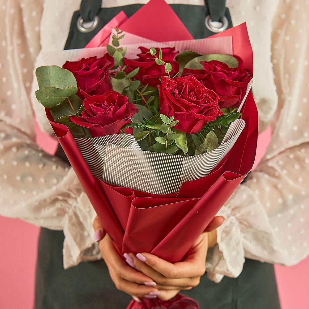 роза (красный) – 5 шт.Эвкалипт – 1 шт.пленка цветная – 1 шт.Лента атласная – 1 шт.
