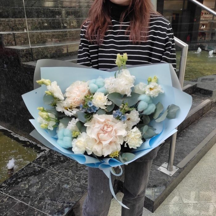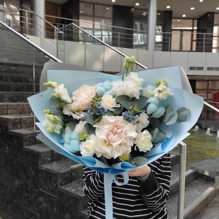 Роза пионовидная – 2 шт.Диантус – 3 шт.Лизиантус – 2 шт.Хлопок – 3 шт.Оксипеталум – 2 шт.Упаковка – 2 шт.Лента – 2 шт.