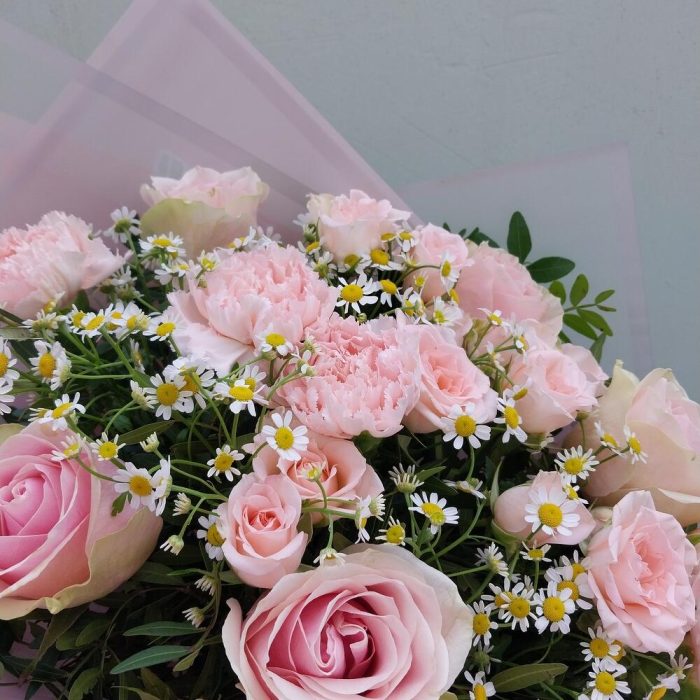 Роза кустовая – 5 шт.Фисташка – 10 шт.Упаковка дизайнерская – 6 шт.Матрикария (Ромашка Камила) – 5 шт.диантус сортовой розовый – 5 шт.фрутетто роза – 5 шт.