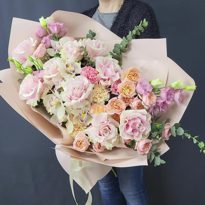 Лизиантус – 5 шт.Эвкалипт – 5 шт.Роза – 9 шт.Гвоздика – 8 шт.Фисташка – 7 шт.Роза пионовидная – 5 шт.Упаковка дизайнерская – 1 шт.орхидеи цимбидиум (бутон) – 6 шт.