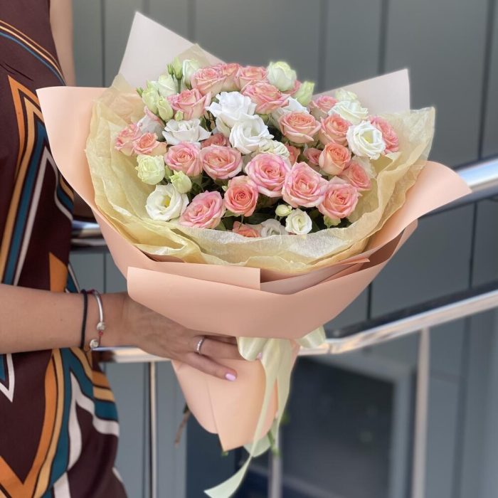кустовая роза азора – 5 шт. эустома белая – 4 шт. Оформление – 1 шт. Писташ – 2 шт.