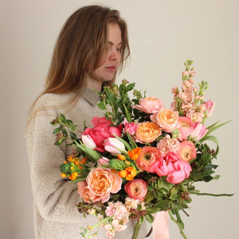 Авторский букет с пионами, ранункулюсами, тюльпанами, маттиолой и кустовыми пионовидными розами.