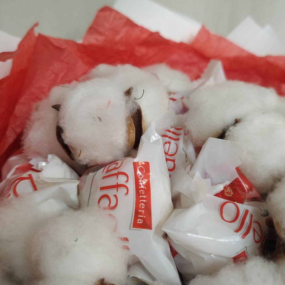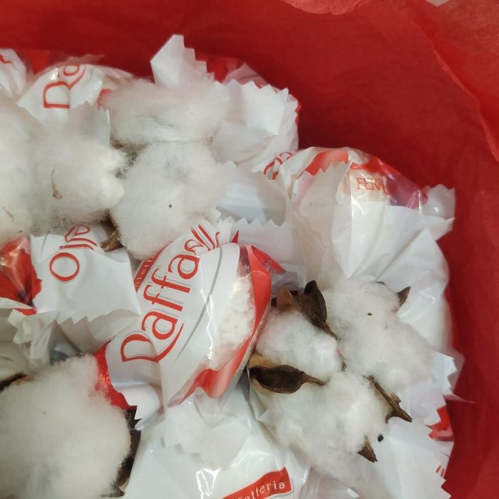 Raffaello конфеты – 19 шт.Хлопок – 8 шт.Тишью – 1 шт.Бумага – 1 шт.Лента – 1 шт.
