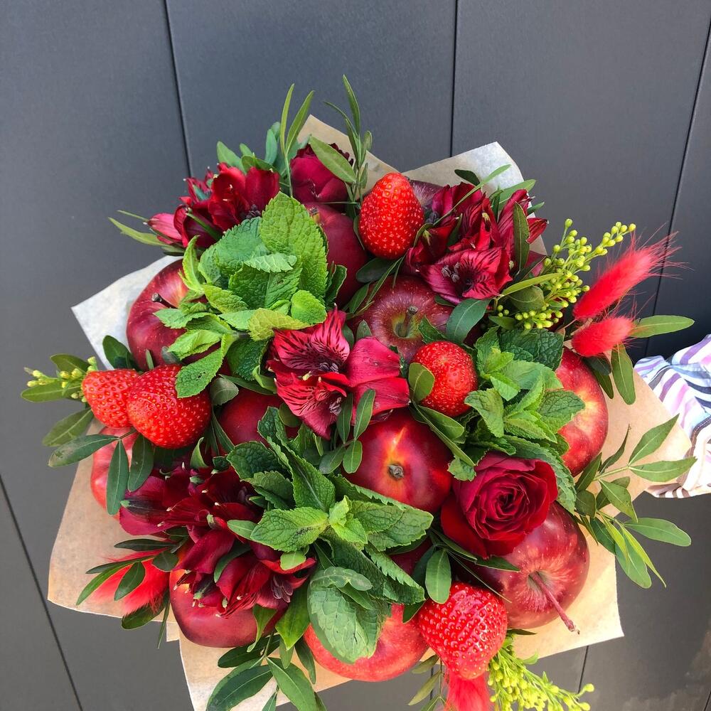 нектарины или слива – 5 шт.яблоки – 5 шт.Клубника – 5 шт.Мята пучок – 3 шт.Альстромерия – 6 шт.Лагурус – 5 шт.фисташка зелень – 2 шт.розы – 2 шт.