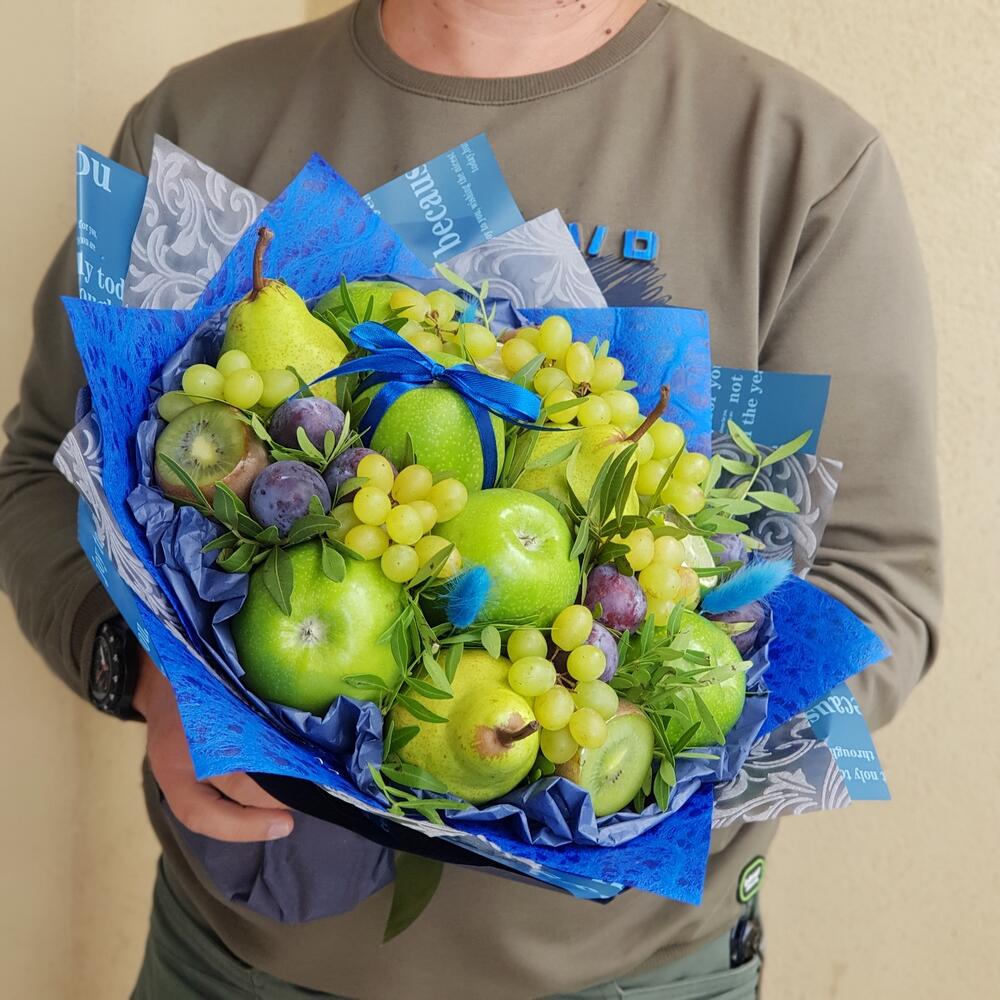 Элегантный фруктовый букет – прекрасный подарок не только для девушек , мужчины веганы , спортсмены оценят по достоинству эту модель.Возможно изменение цвета упаковки на нежные оттенки ( пожелания пишите в комментариях при оформлении заказа )