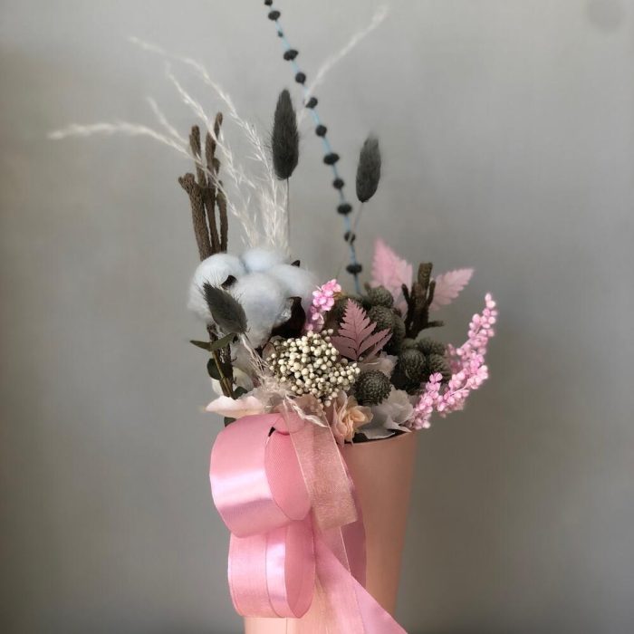 Стакан – 1 шт.Оазис для сухоцветов – 1 шт.Каапс – 1 шт.озатомнус – 1 шт.Ковыль – 1 шт.Лагурус – 3 шт.сорго – 1 шт.Папоротник – 1 шт.Лаванда – 1 шт.
