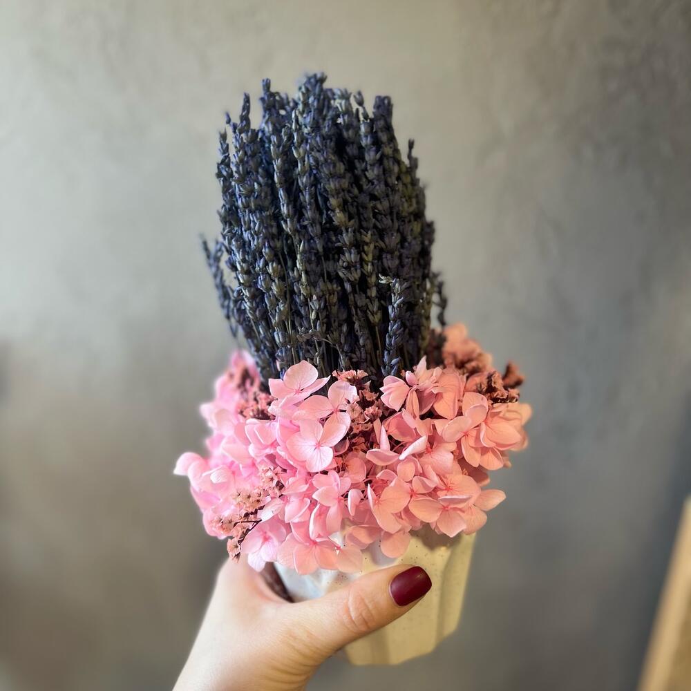 лаванда стабилизированная пучок – 1 шт.гортензия стабилизированная – 1 шт.Лимониум – 3 шт.Керамическое кашпо – 1 шт.
