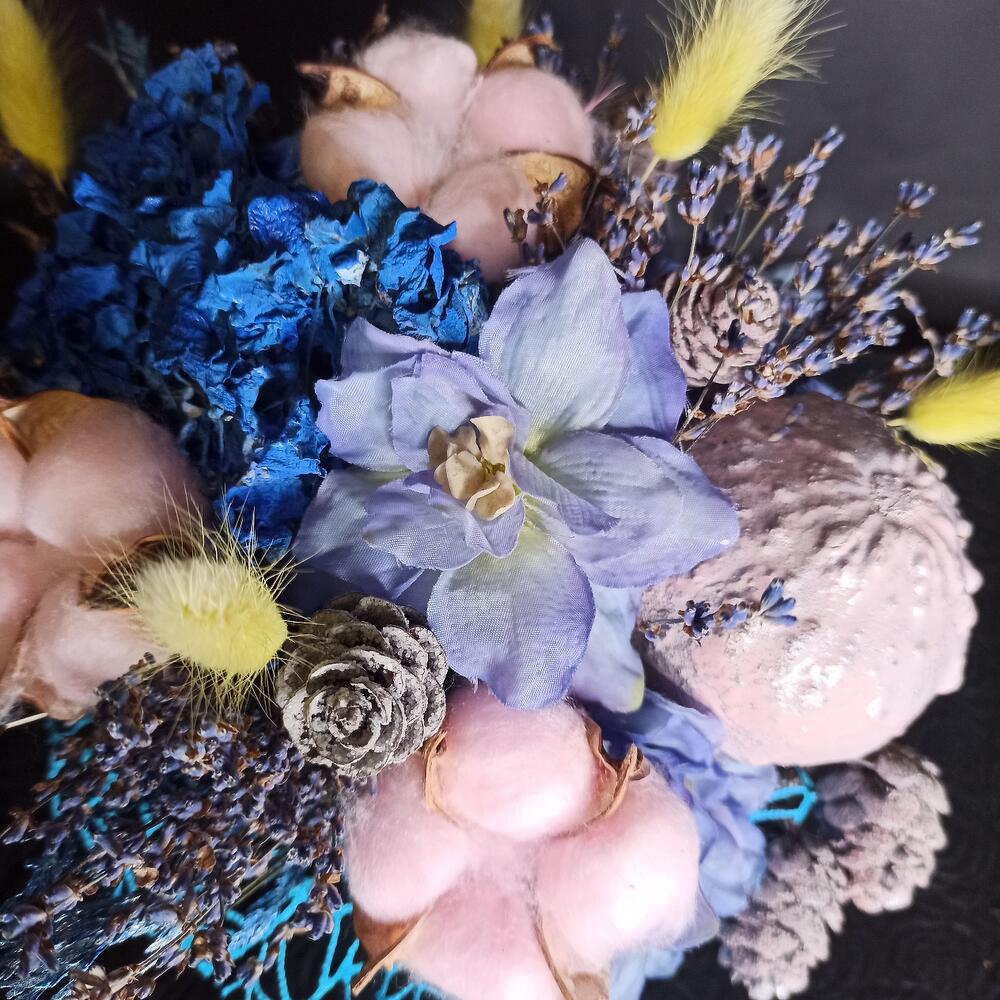 Кашпо керамическое – 1 шт.Оазис флористический – 1 шт.Лаванда (сухоцвет) – 1 шт.Гортензия – 1 шт.Хлопок – 3 шт.Лагурус – 6 шт.цветы искусственные – 4 шт.Шишки натуральные – 5 шт.Туя – 3 шт.Тыква декоративная – 1 шт.