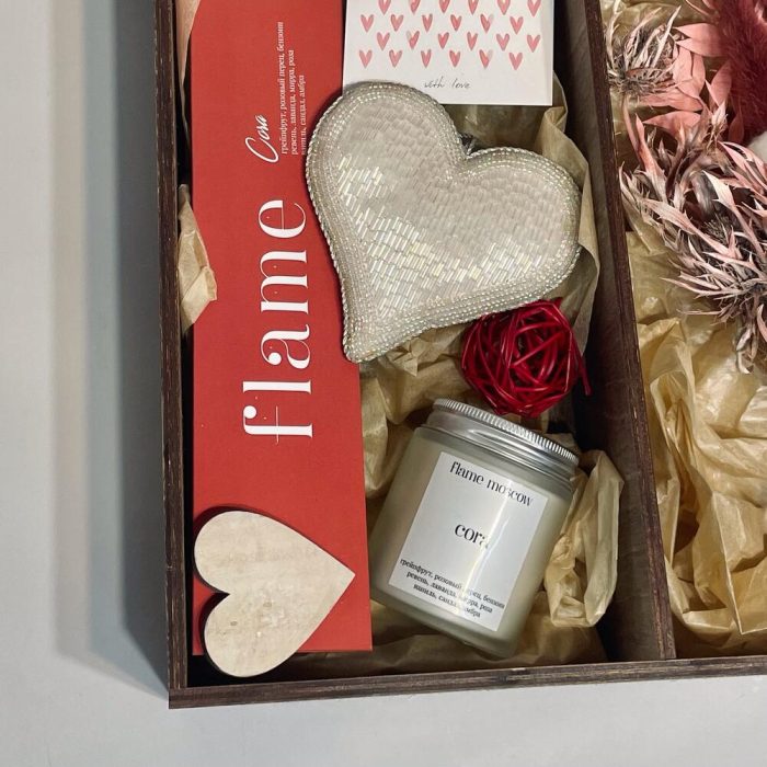 свеча (кокосовый воск) – 1 шт.благовония – 1 шт.сердце декоративное – 1 шт.Сердце деревянное – 2 шт.Шар ротанг – 2 шт.Открытка – 1 шт.рускус стабилизированный – 1 шт.Хлопок – 2 шт.эрингиум сухоцвет – 1 шт.Лагурус (сухоцвет) – 7 шт.Тишью – 1 шт.Ящик деревянный – 1 шт.