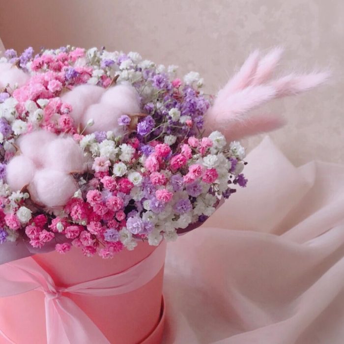 Очаровательная композиция из изысканных свежих цветов.Наполнена множеством соцветий радужной гипсофилы, мягкого хлопка и лагуруса. Собрана в стильной шляпной коробке.Композиция из гипсофилы – необычный подарок, который удивит своей невероятной стойкостью, при правильном и простом уходе.❤️ Ставить композицию в прохладном месте, избегая отопительных приборов и прямых солнечных лучей. ❤️ Подливать немного воды в серединку.Гипсофила не вянет, а становится сухоцветом, сохраняя свой вид. Поэтому композиция продолжит радовать ещё очень долго!Чтобы защитить готовый букет во время доставки от любых погодных условий, мы бережно его упаковываем