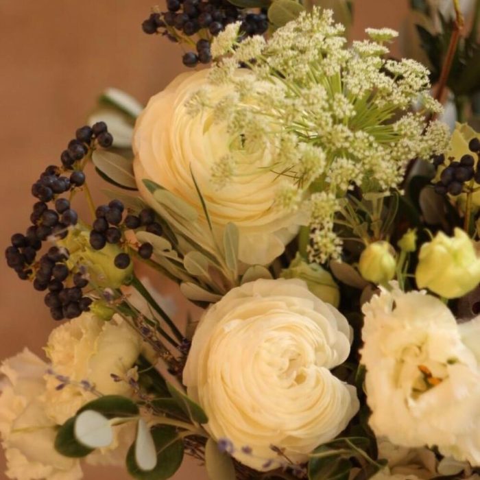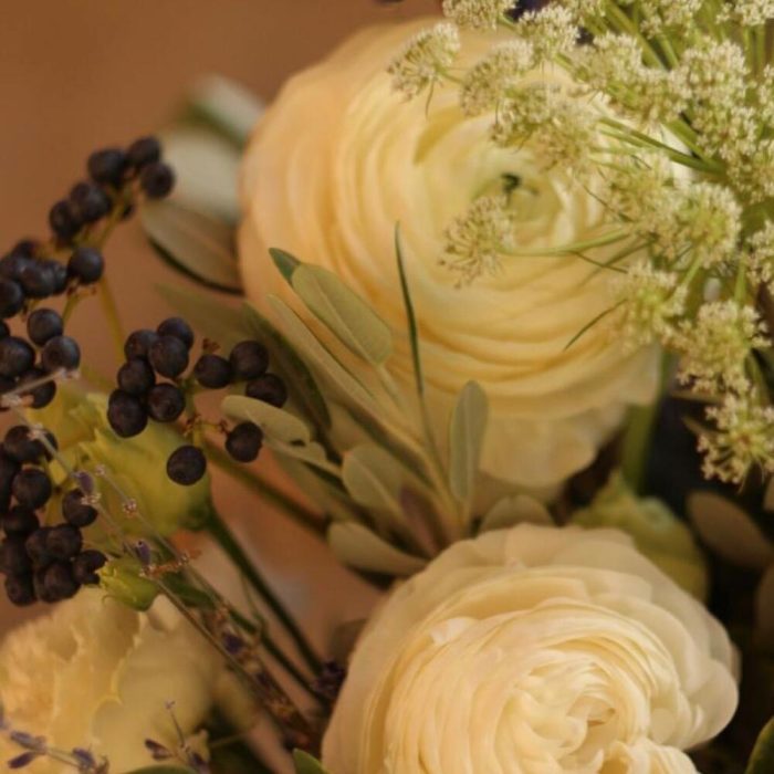 Кремовый букет с ранункулюсами, колокольчиками, лизиантус коробочками лотоса, лавандой и садовой зеленью.