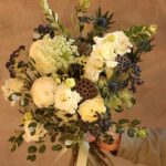 Ранункулюс – 3 шт.Лизиантус – 3 шт.Эрингиум – 2 шт.Лотос (коробочка) – 2 шт.Вибурнум ягодный – 4 шт.Амми – 2 шт.Лаванда – 15 шт.Питтоспорум – 3 шт.Лента – 1 шт.