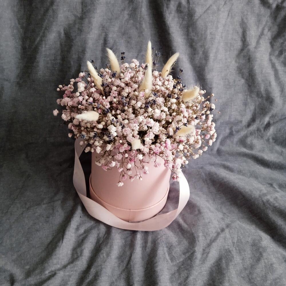 Розовая гипсофила в шляпной коробке М