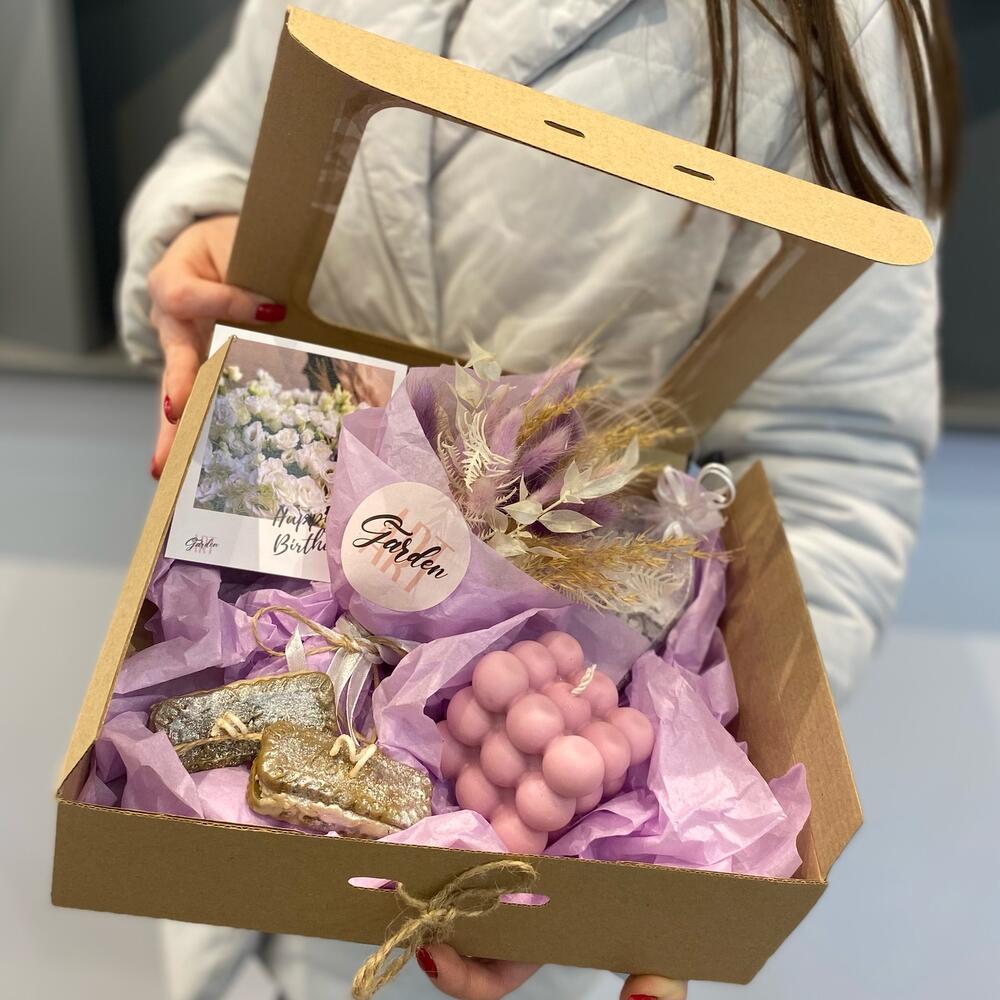 букет из сухоцветов – 1 шт.свеча шоколадное печенье – 2 шт.свеча пузыри – 1 шт.аромасаше с лавандой – 1 шт.Открытка – 1 шт.Коробка – 1 шт.