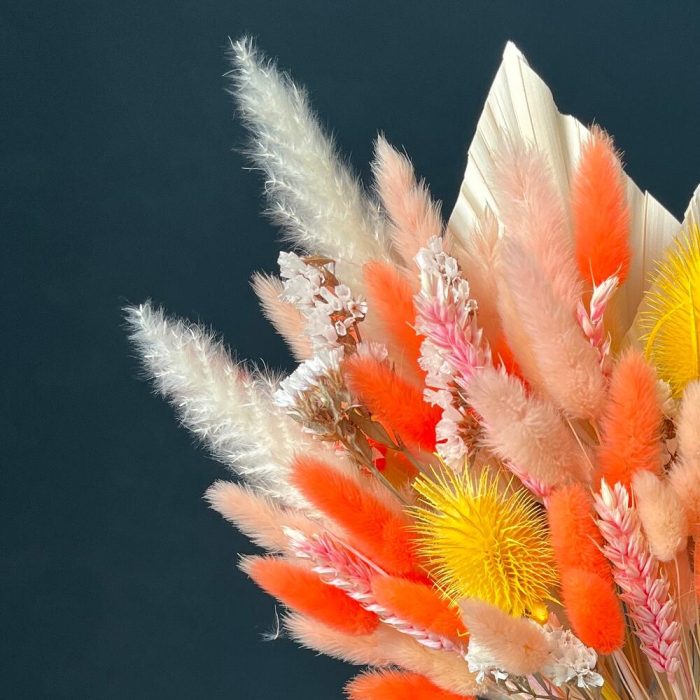 Лагурус (сухоцвет) – 80 шт.ворсянка сухоцвет – 4 шт.статица стабилизированная – 5 шт.пальма сухоцвет – 2 шт.Колосья пшеницы – 10 шт.пампас мини – 3 шт.