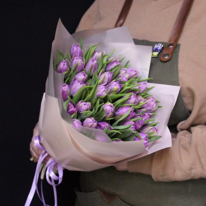 Тюльпан пионовидный дабл прайс – 35 шт.Пленка дизайнерская – 3 шт.Лента атласная – 1 шт.