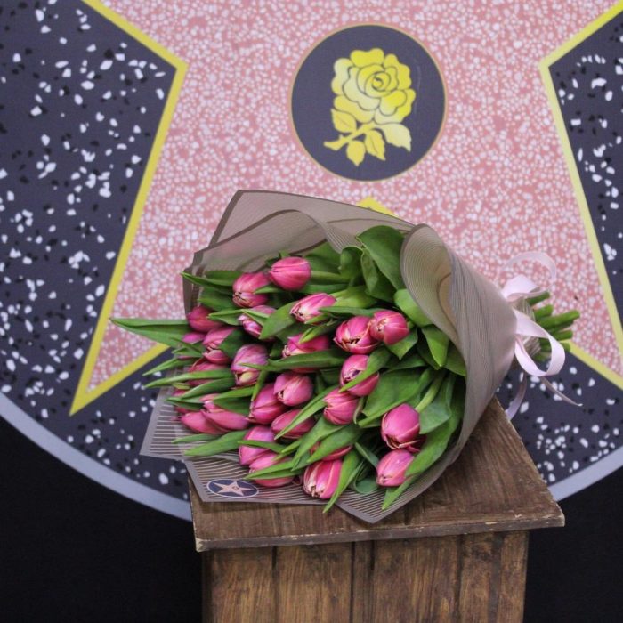 тюльпан пионовидный коламбус – 25 шт.Пленка дизайнерская – 2 шт.Лента атласная – 1 шт.