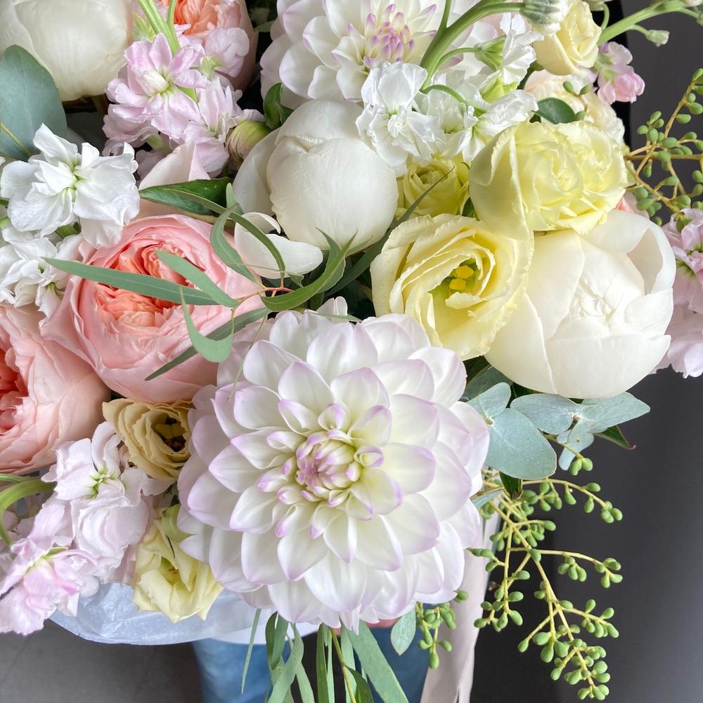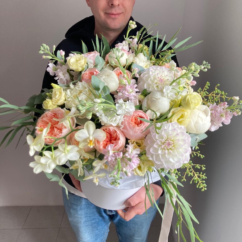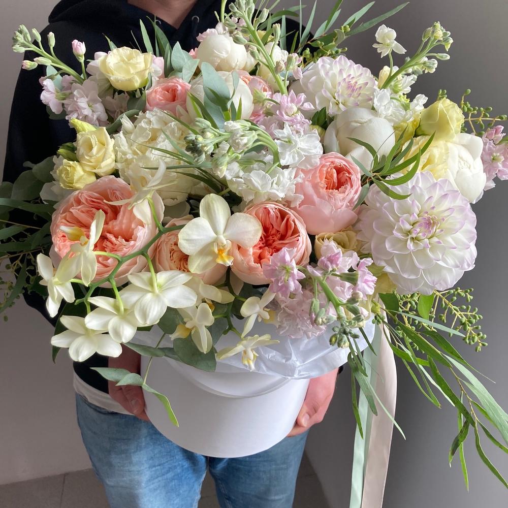 орхидея – 2 шт.Георгина – 3 шт.Роза пионовидная – 15 шт.Пион – 5 шт.Маттиола – 11 шт.Лизиантус – 3 шт.Эвкалипт – 7 шт.Шляпная коробка – 1 шт.Тишью – 2 шт.Лента атласная – 1 шт.