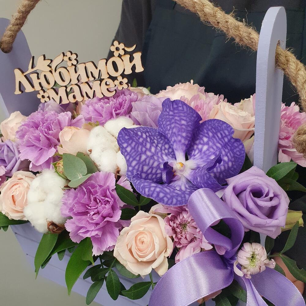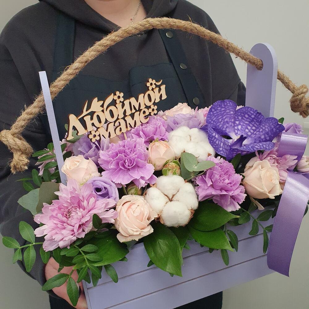 Ящик деревянный – 1 шт.Оазис флористический – 1 шт.Диантус – 3 шт.Хлопок натуральный – 3 шт.Топпер – 1 шт.Лизиантус – 1 шт.Хризантема – 1 шт.Ванда – 1 шт.Роза кустовая – 2 шт.Лента атласная – 1 шт.